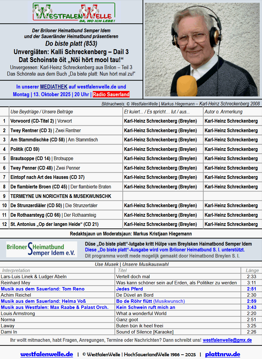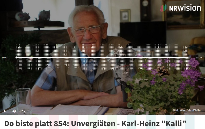 « 852 854 » Do biste platt - Ausgabe 853 Unvergiäten - Karl-Heinz Schreckenberg - Dail 3 - Dat Schoinste öit Inhaltsangabe zur Sendung: