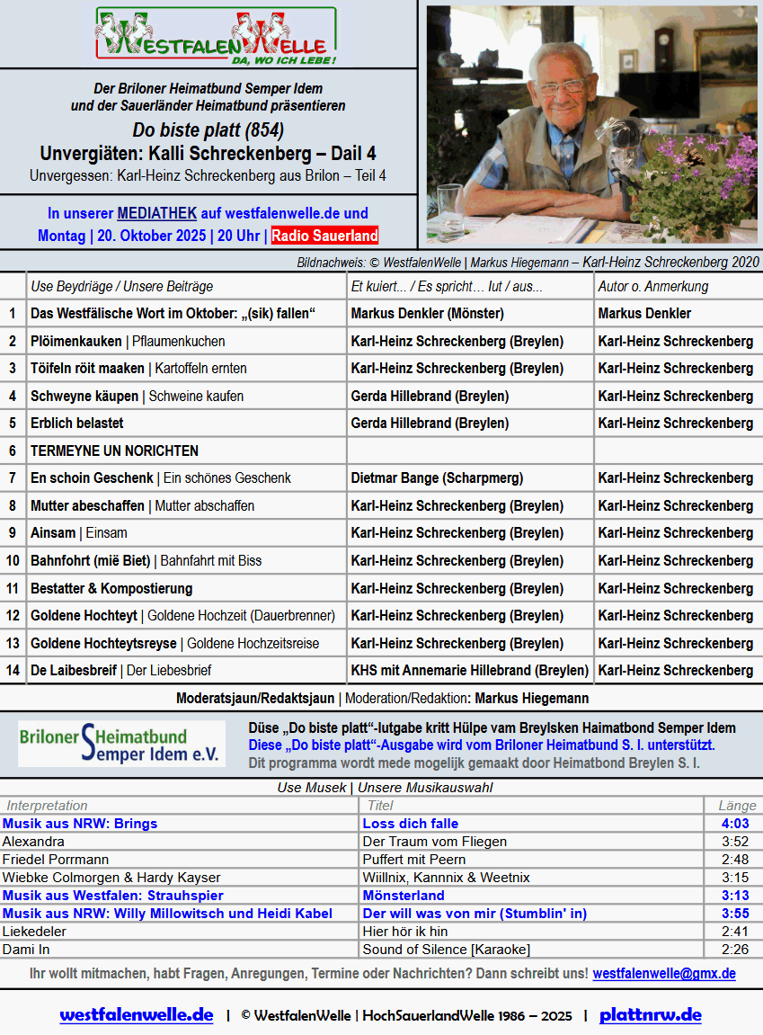 « 853 846 » Do biste platt - Ausgabe 854 Unvergiäten - Karl-Heinz "Kalli" Schreckenberg - Dail 4 Inhaltsangabe zur Sendung: